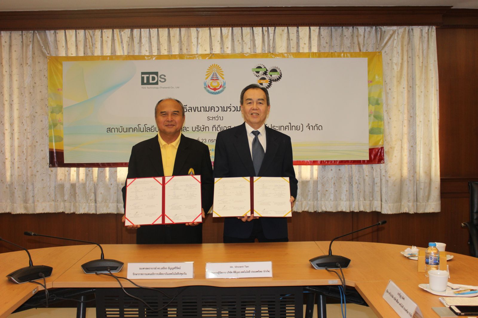 ภาพบรรยากาศพิธีลงนามความร่วมมือระหว่าง บริษัท ทีดีเอส เทคโนโลยี ประเทศไทย (จำกัด) โดย Mr.Vincent Tan กรรมการผู้จัดการ และสถาบันเทคโนโลยีปทุมวัน โดยรองศาสตราจารย์ ดร.เสถียร ธัญญศรีรัตน์ รักษาราชการแทนอธิการบดีสถาบันเทคโนโลยีปทุมวัน